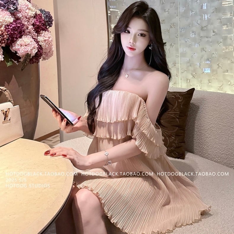 Off-shoulder pleats one piece