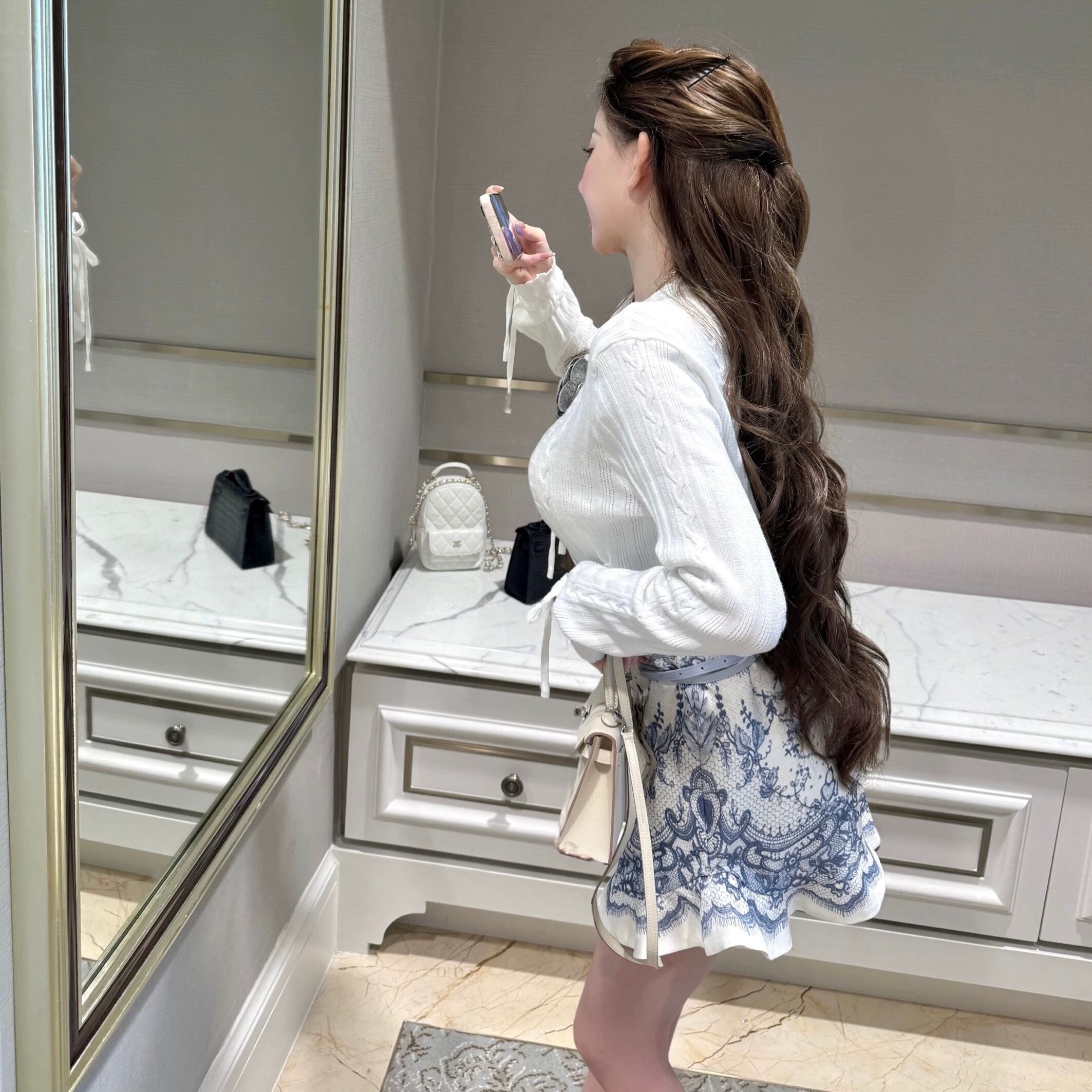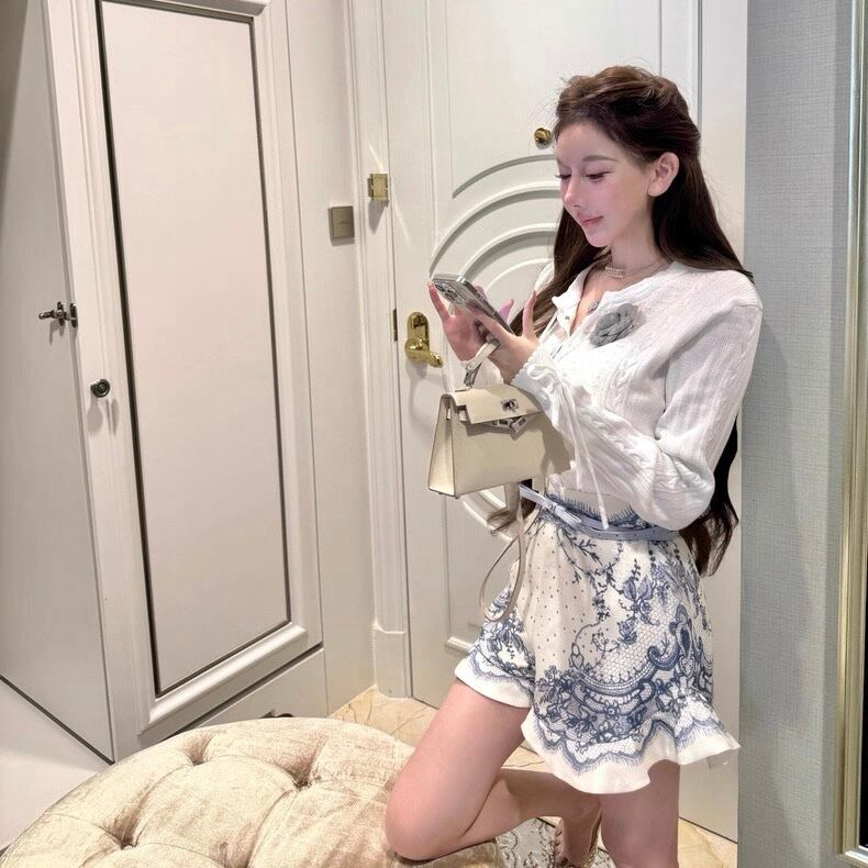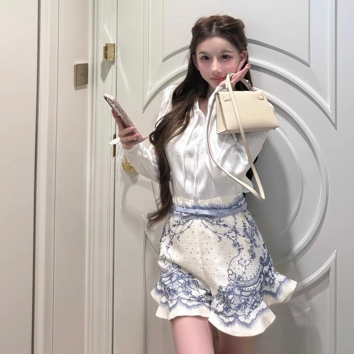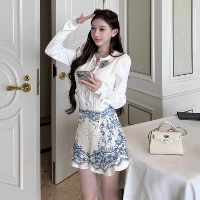 ホワイト地にブルーの繊細な刺繍風プリントが施され、エレガントさと可憐さを演出します。